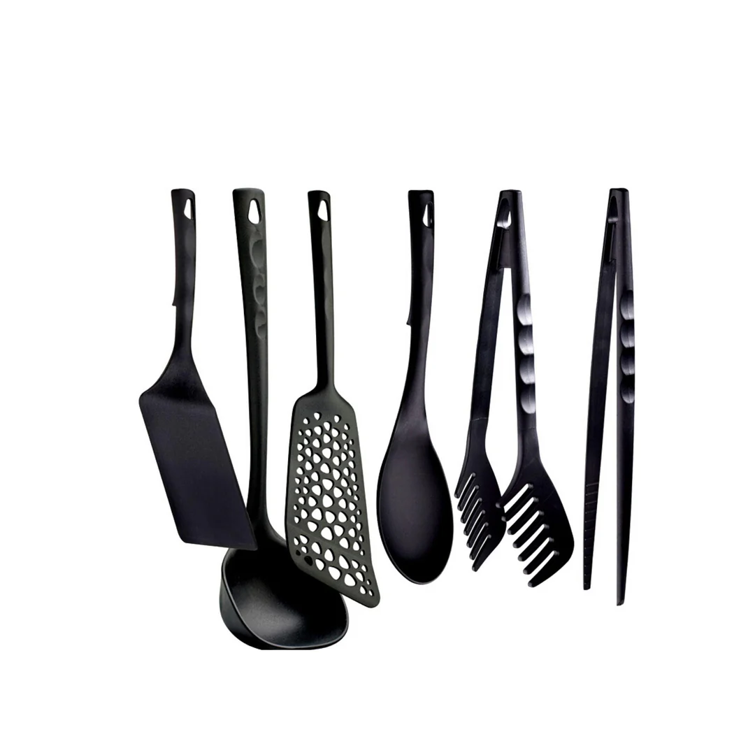 This 6-piece nylon fibre utensil set includes chef pliers, perforated shovel, ladle, rice spoon, chef shovel, and spaghetti server. Heat-resistant up to 220°C, non-toxic, odour-resistant, and safe for non-stick surfaces, it offers durability and practicality for modern kitchens. Dishwasher safe, 100% Made in Italy, and fully recyclable.